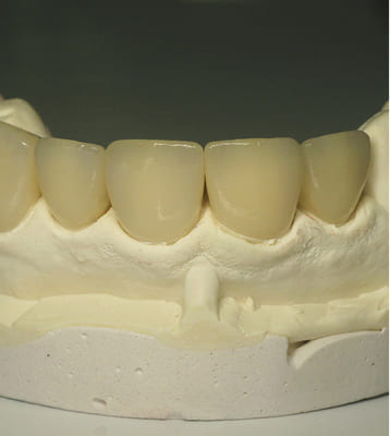 Este tipo de rehabilitación está diseñado para pacientes exigentes que buscan la máxima naturalidad en sus dientes. La base es de zirconio, adaptada al color del sustrato del paciente, y luego se carga con cerámica feldespática.